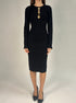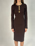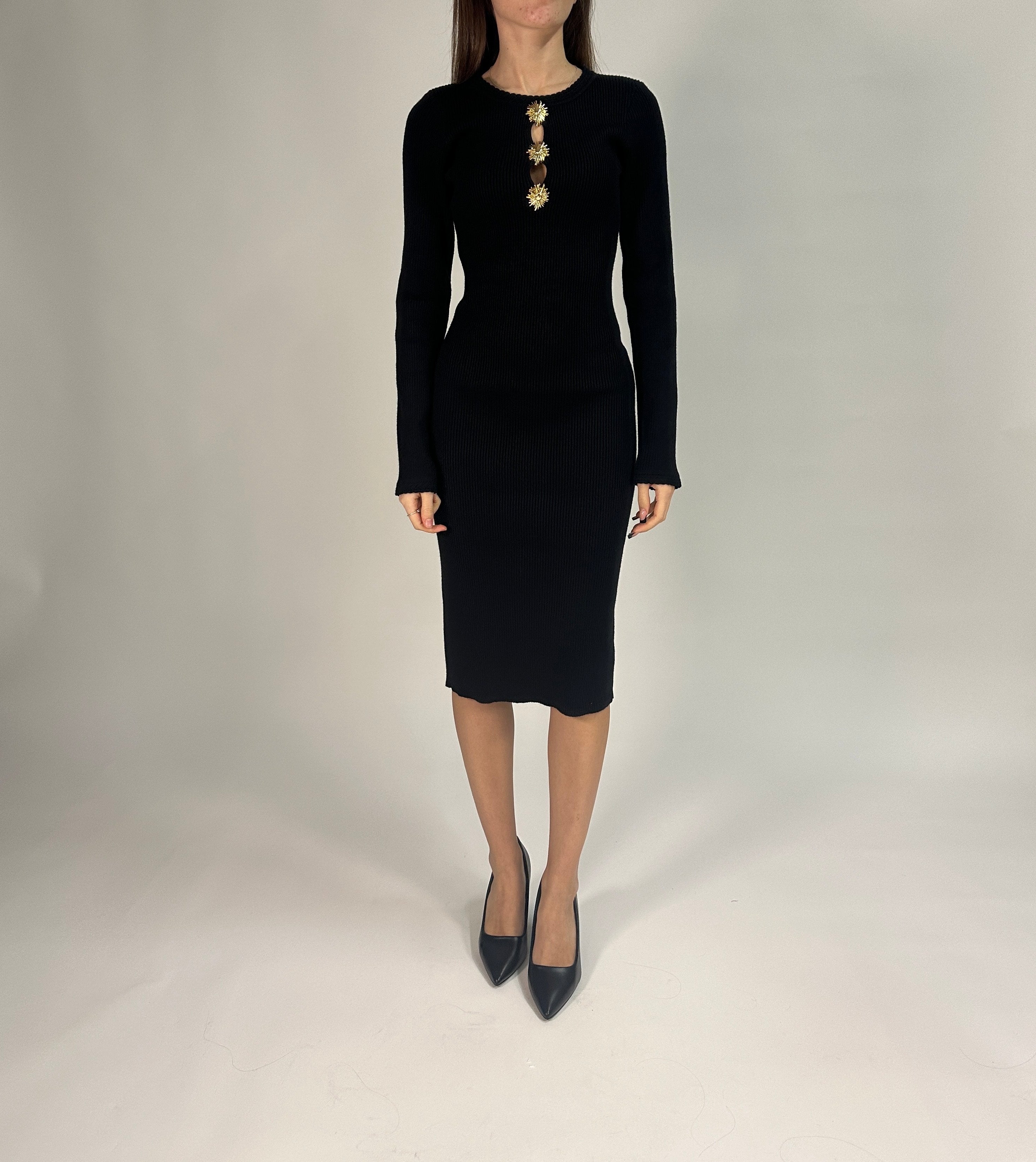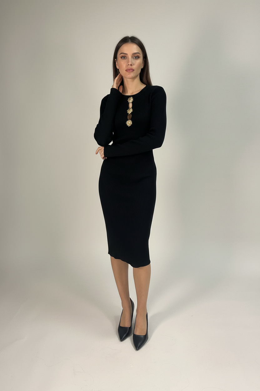 Abito midi in maglia a maniche lunghe, caratterizzato da una silhouette aderente che valorizza la figura. Il design è impreziosito da eleganti applicazioni gioiello sullo scollo con aperture a goccia, per un tocco sofisticato e femminile. Perfetto per serate eleganti o occasioni speciali con stile senza tempo.
