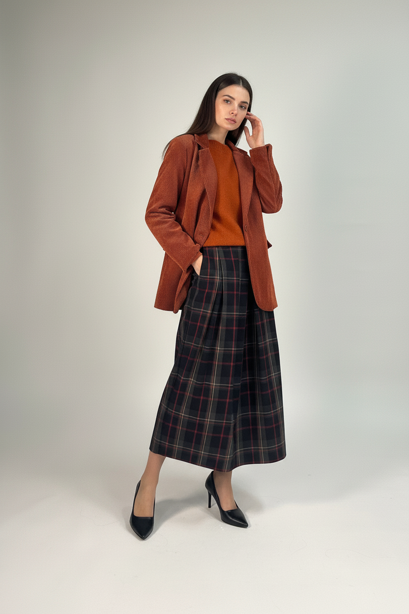 Blazer monopetto in velluto a coste dal taglio morbido e struttura destrutturata. Il colore terracotta caldo e avvolgente aggiunge personalità e raffinatezza al look. Rever classico, tasche frontali con pattina e chiusura a un bottone completano il design essenziale ma distintivo.