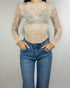 Body a maniche lunghe con effetto pizzo , leggero e semi-trasparente. Raffinato e versatile, ideale per look eleganti o romantici. Disponibile in nude e cipria.
