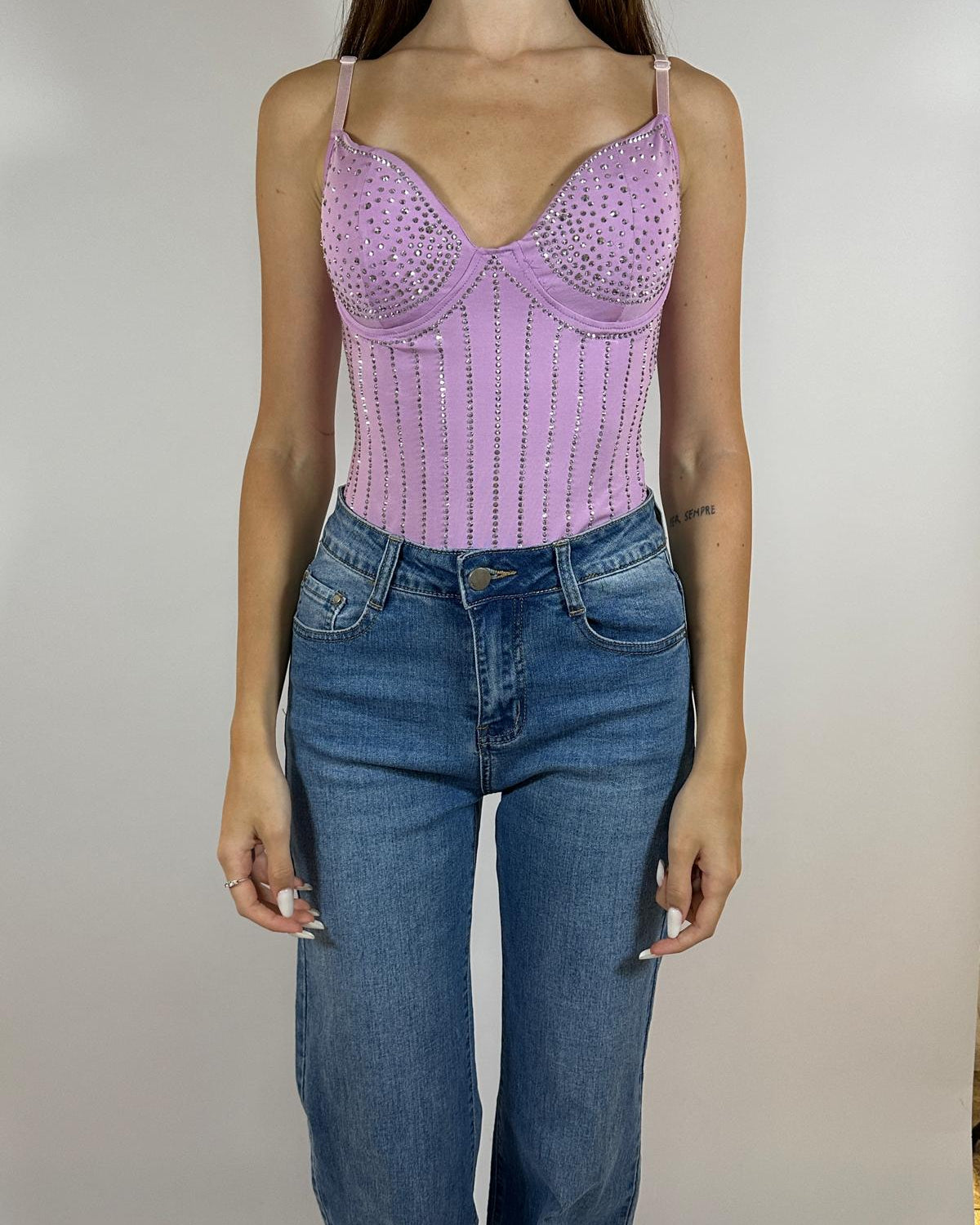 Accendi il tuo look con questo body glam dal design audace. Le coppe imbottite valorizzano il décolleté, mentre i dettagli scintillanti che attraversano il busto scolpiscono la silhouette con eleganza. Un capo irresistibile, perfetto per serate speciali e outfit da protagonista.