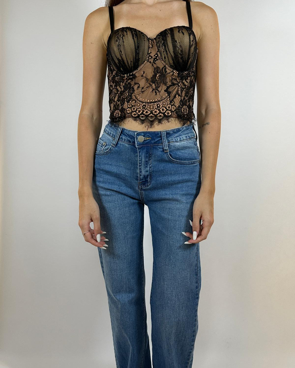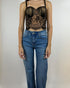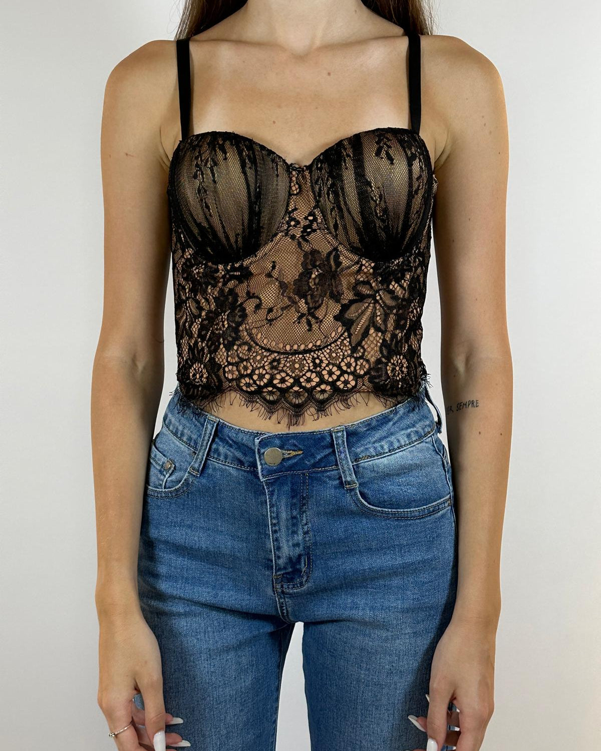 Elegante bustino con raffinato motivo floreale traforato nero su base nude, per un contrasto sofisticato. Il design strutturato valorizza la figura e offre supporto, ideale per aggiungere un tocco di glamour a ogni outfit.