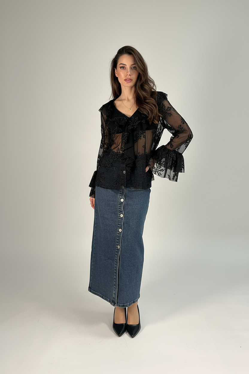 Camicetta donna in tulle trasparente nero, decorata con ricami floreali raffinati e volant sul davanti e alle maniche. Un capo sofisticato e femminile, ideale per outfit da sera o look eleganti da giorno. Perfetta da abbinare a gonne o pantaloni a vita alta.