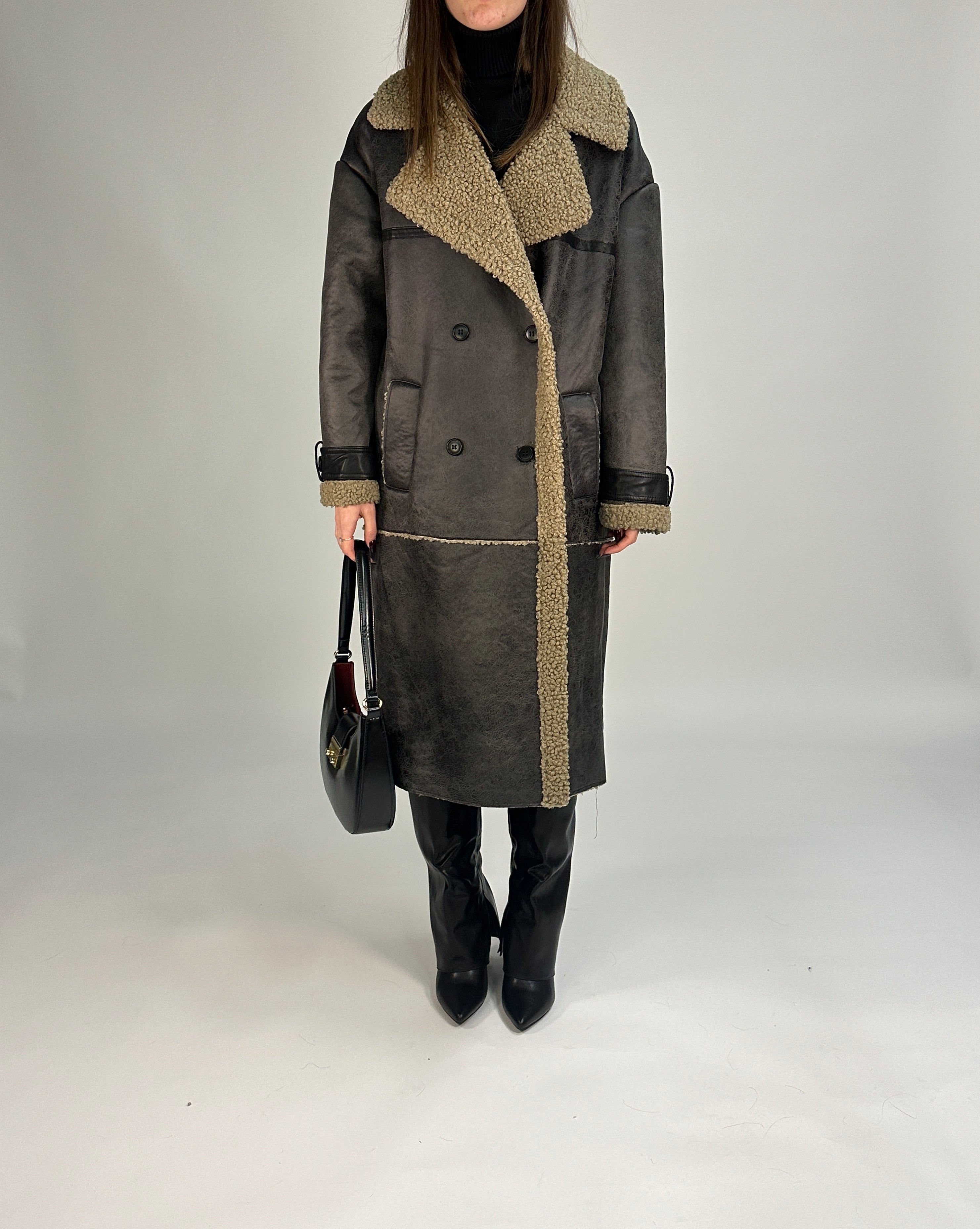 Un capo outerwear di forte carattere, ispirato ai classici modelli shearling e reinterpretato in chiave moderna. La texture effetto pelle opaca si combina con inserti in morbido peluche che valorizzano il maxi revers, l’interno e i bordi, creando un contrasto elegante e ricercato. La linea lunga e avvolgente offre un’immediata sensazione di calore, rendendolo perfetto per la stagione invernale con stile.