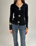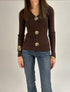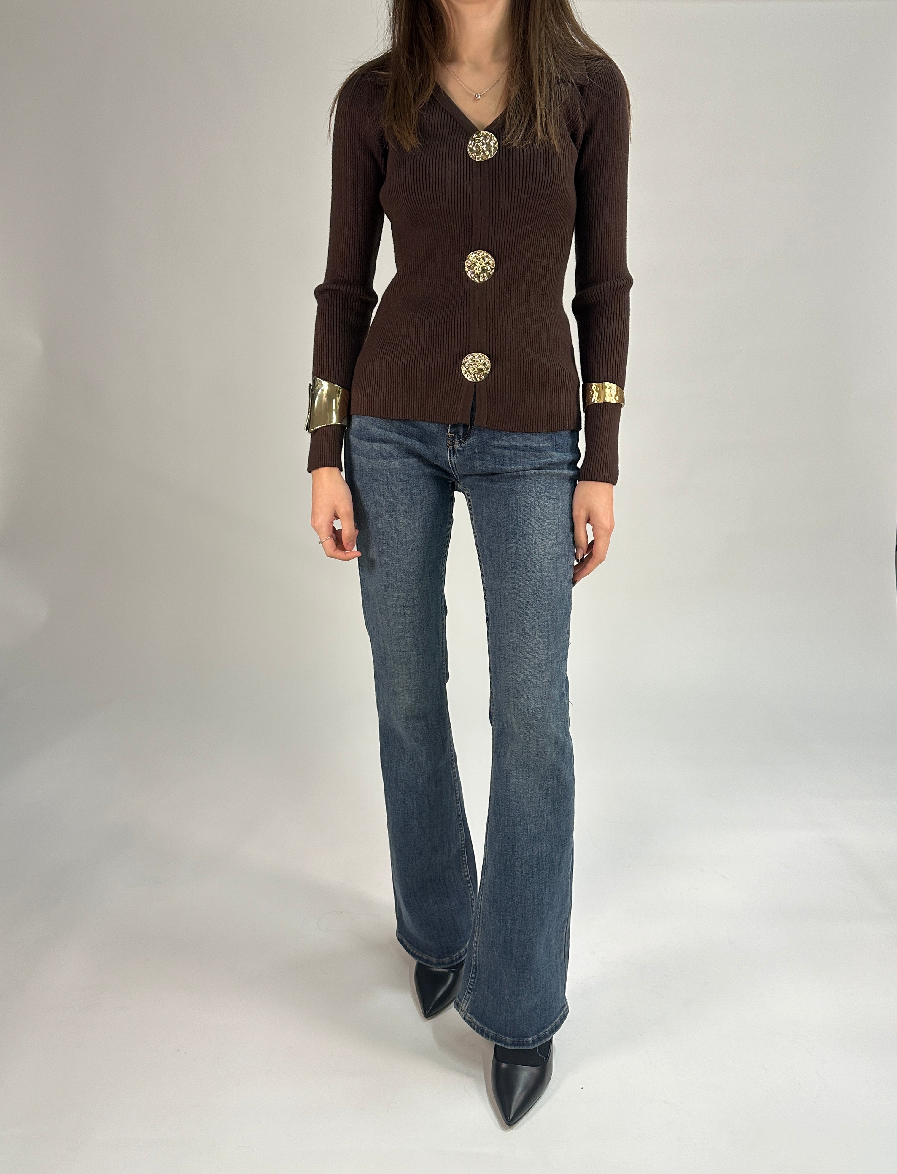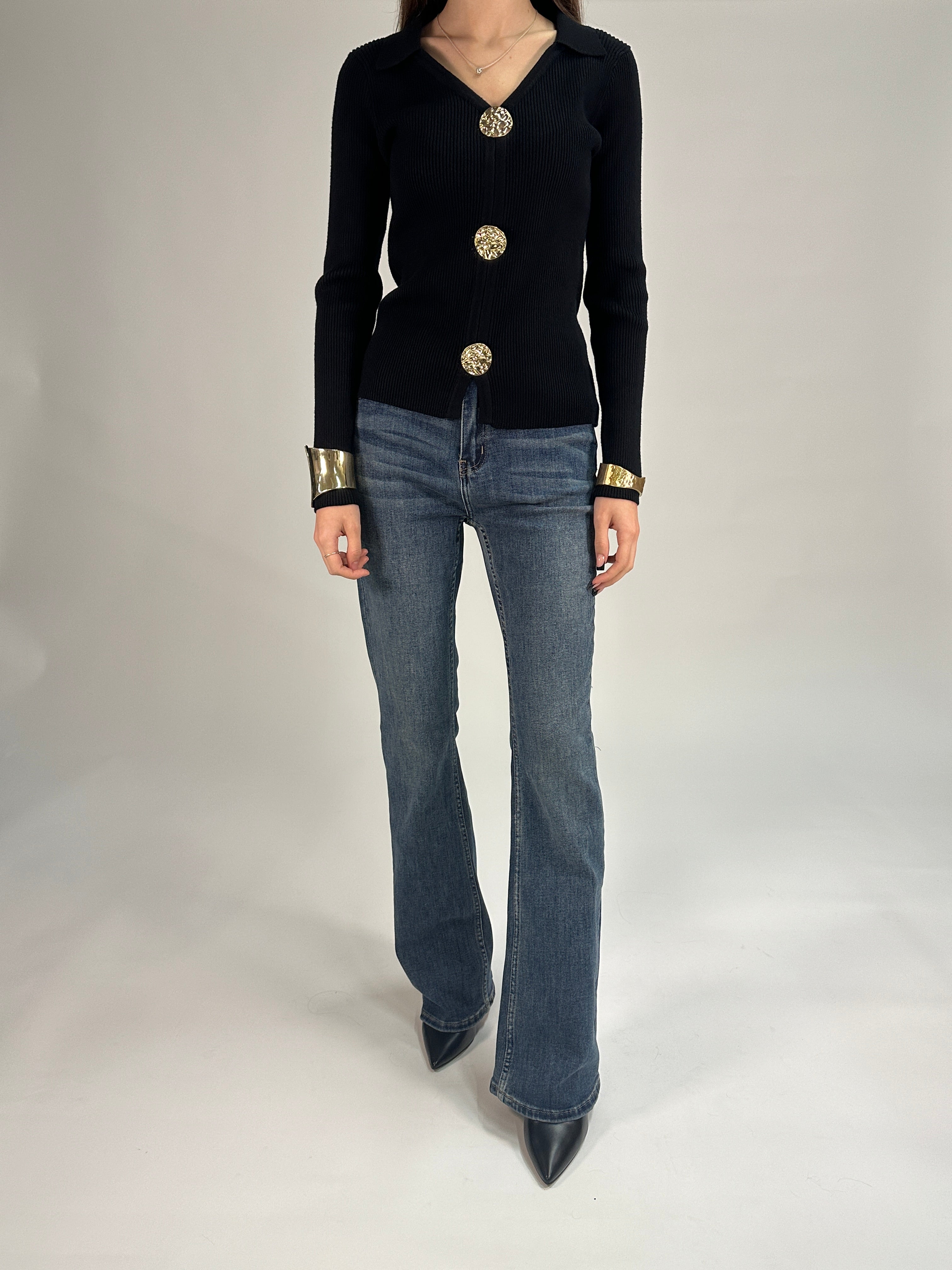 Cardigan elegante a costine con colletto a punta e grandi bottoni decorativi. Linea aderente, ideale per ogni occasione.