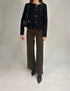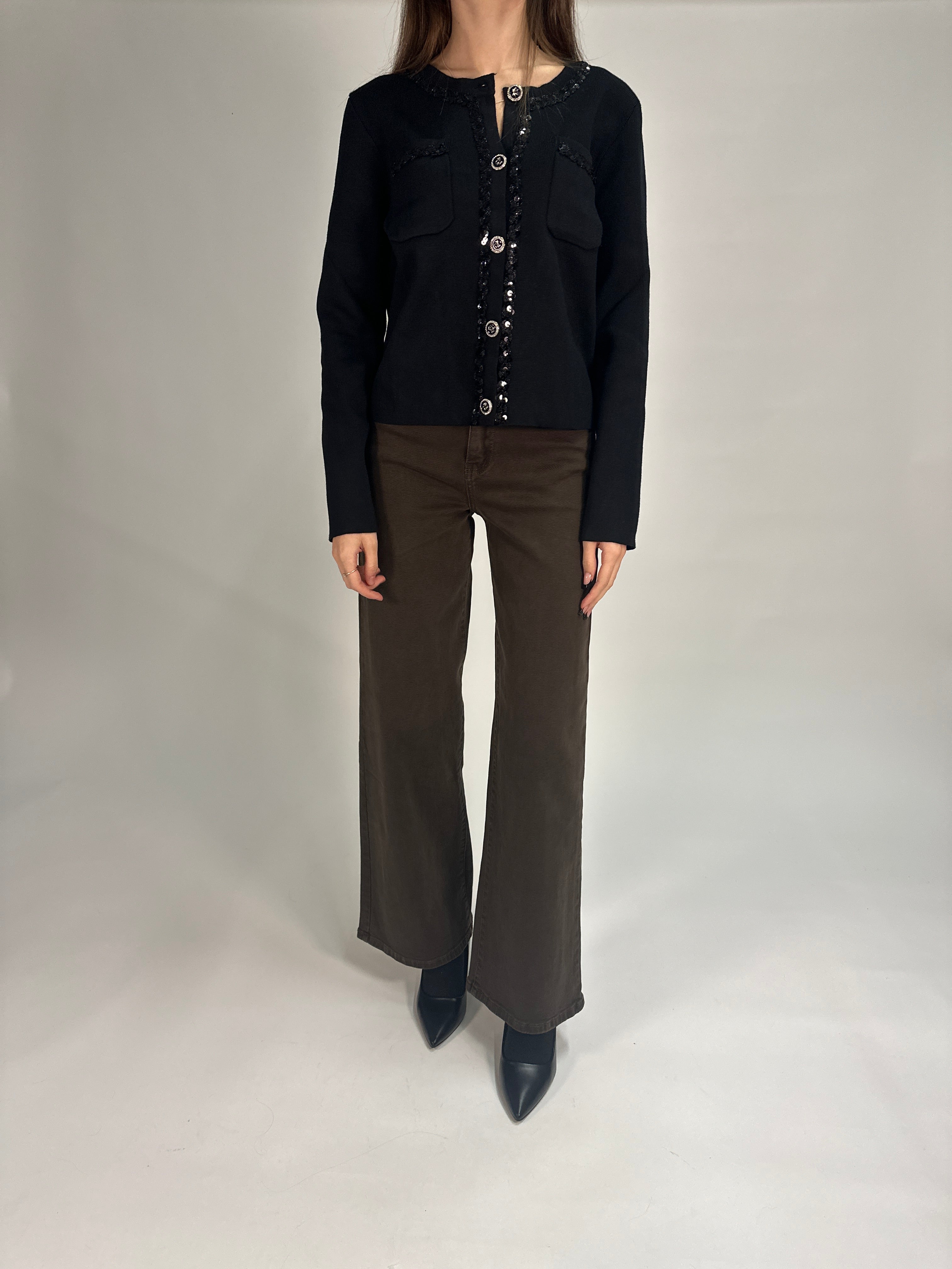 Elegante cardigan nero con dettagli in paillettes che arricchiscono il collo e le tasche. Con bottoni decorativi e un design corto, è il capo perfetto per un look raffinato e versatile, adatto a ogni occasione.