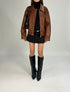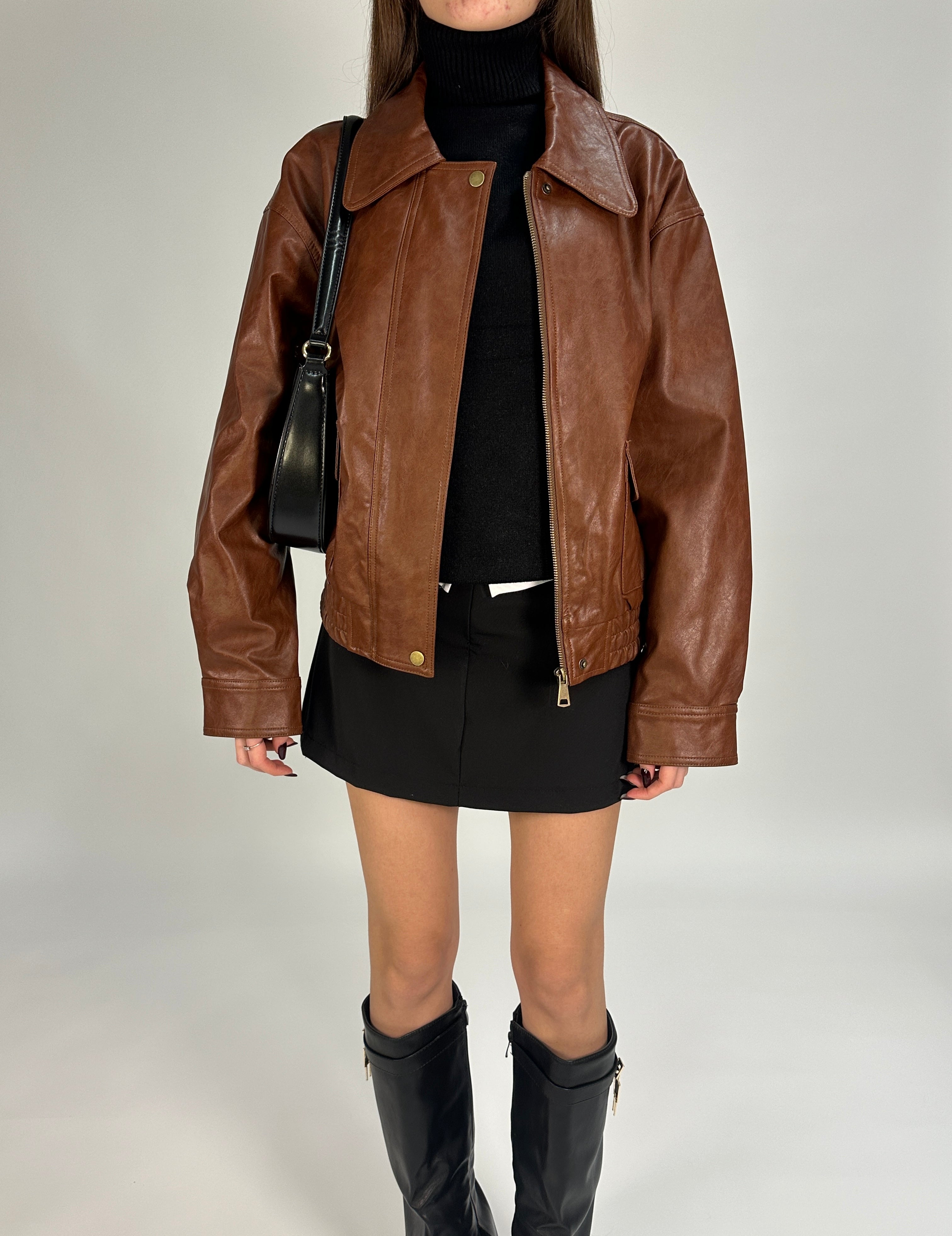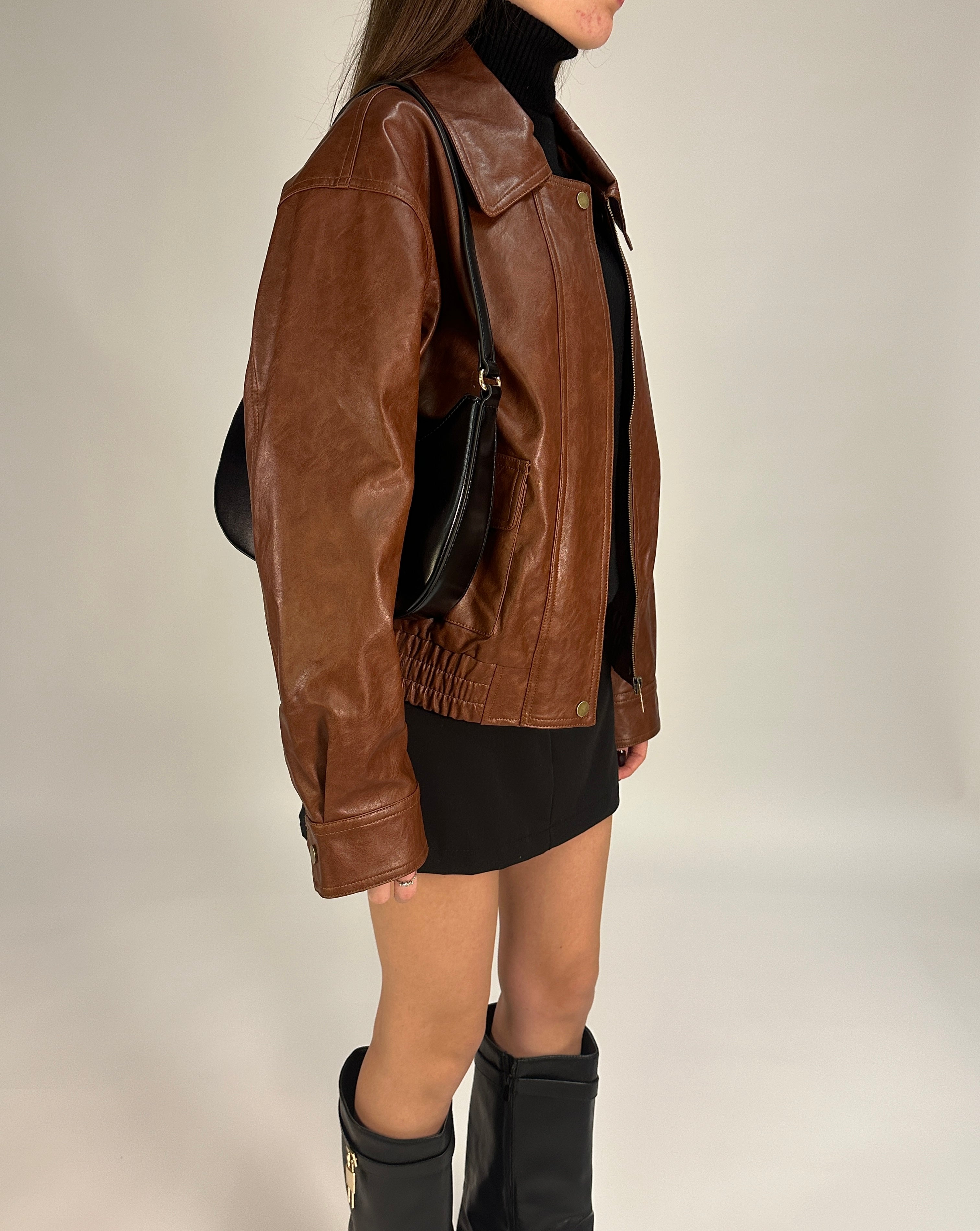 Un bomber dalla silhouette contemporanea, realizzato in materiale effetto pelle color cognac, con taglio leggermente oversize e dettagli minimal. Ideale per chi vuole un look chic e deciso: abbinala a stivali alti e minigonna per un’allure metropolitana, oppure a jeans per un outfit elegante ma casual.