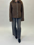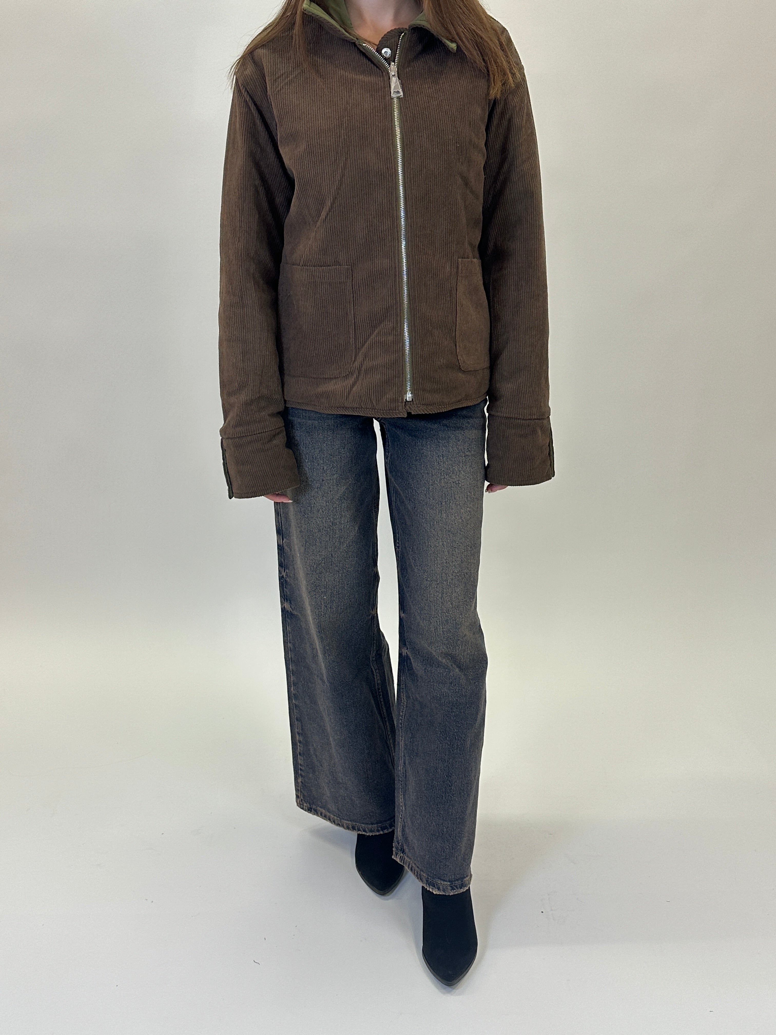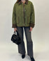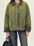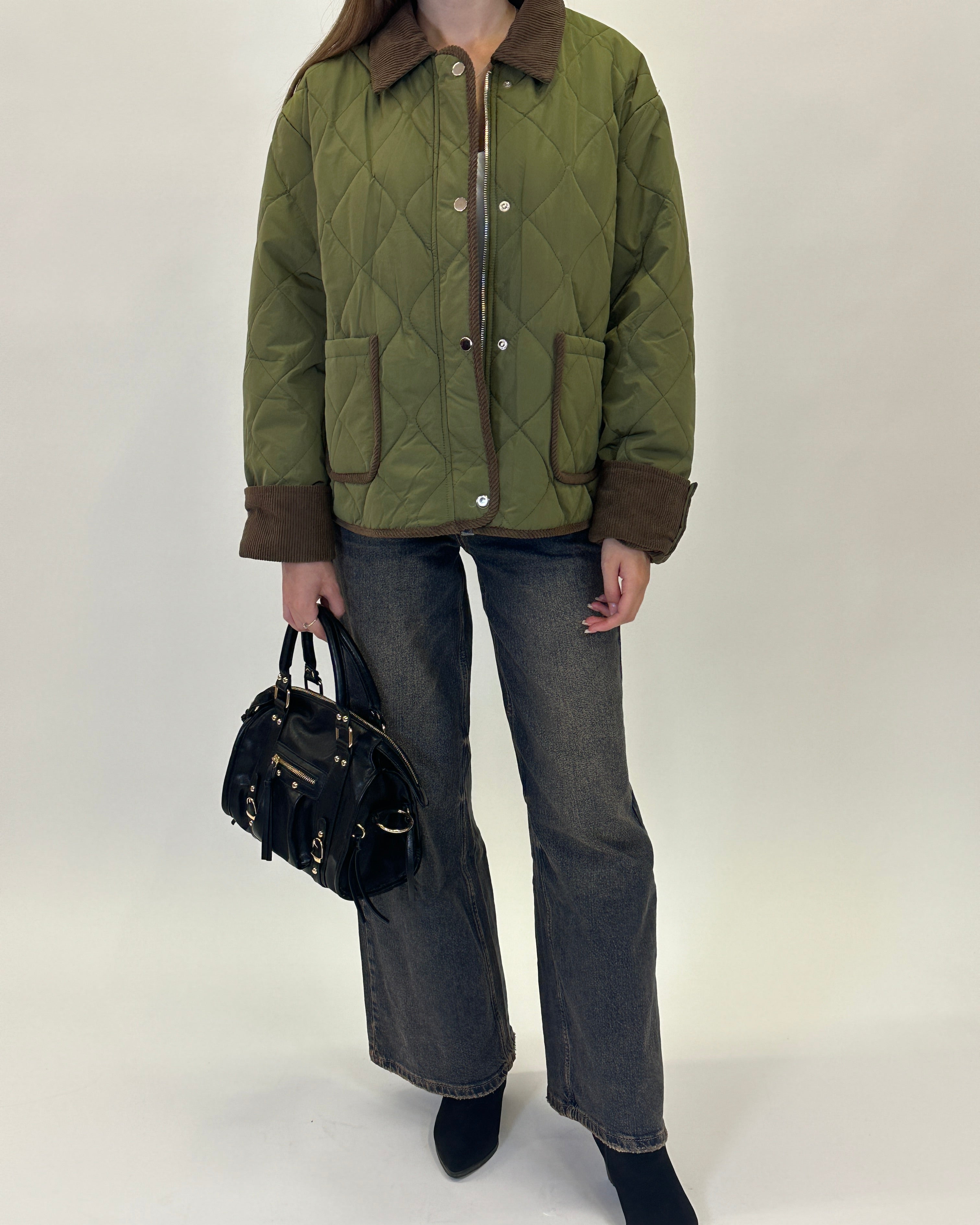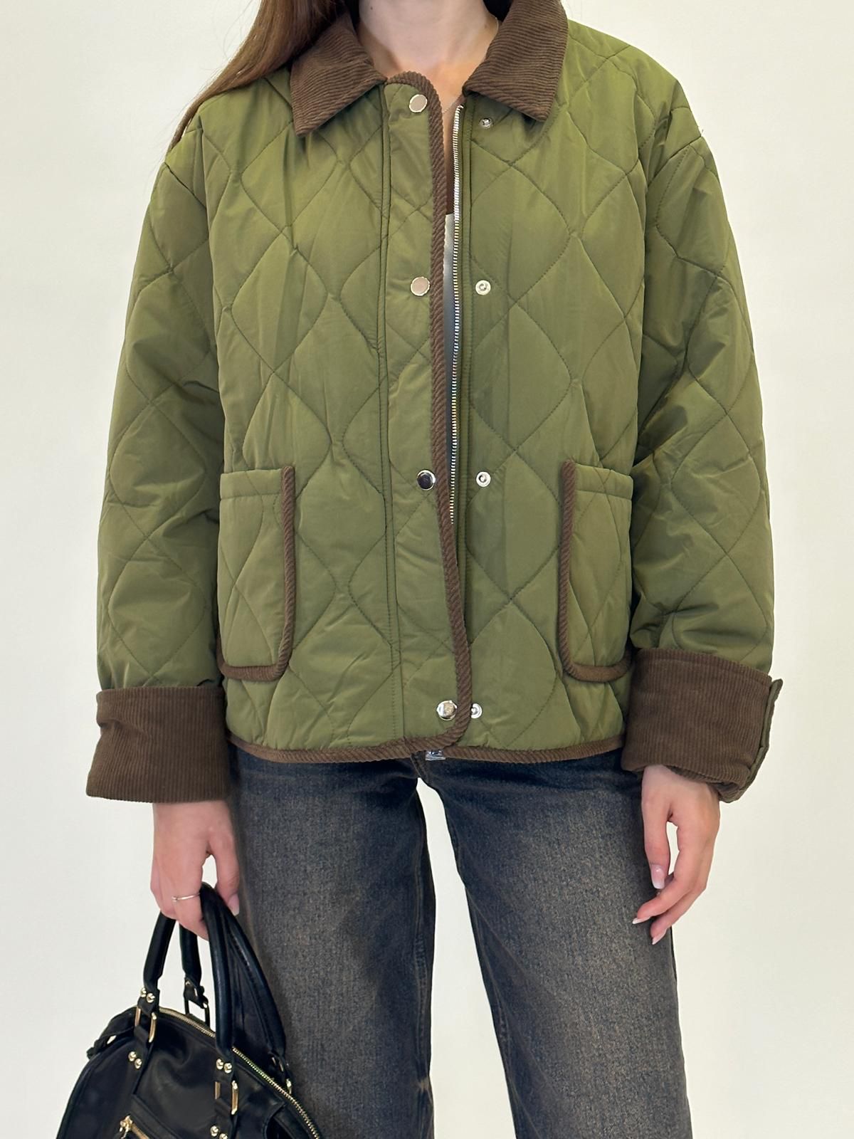 Giacca trapuntata verde con colletto e polsini in velluto a coste marrone. Calda, comoda e ideale per un look casual e versatile.