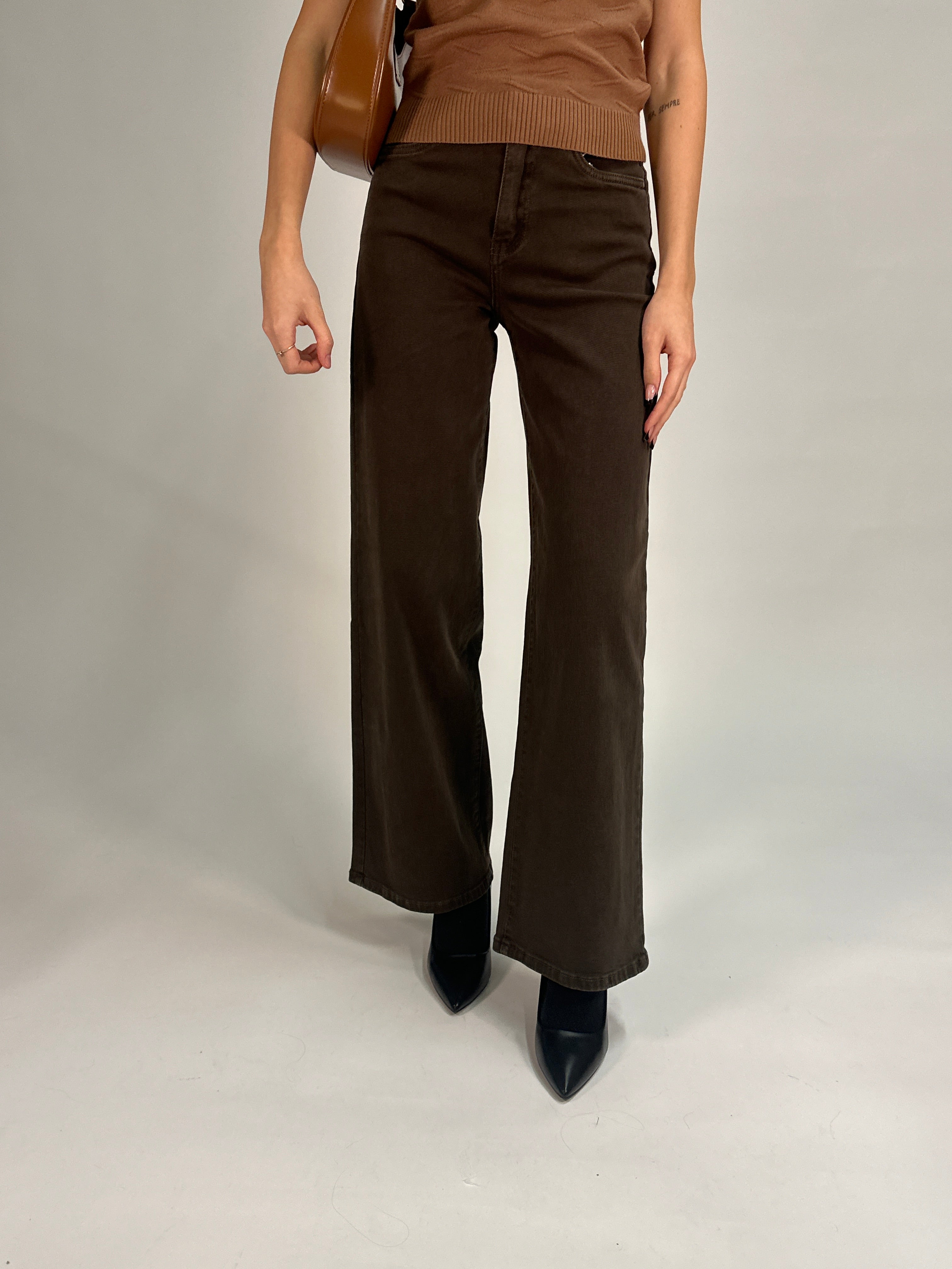 Jeans a vita alta in cotone stretch, taglio dritto e vestibilità comoda. Ideale per un look casual ma curato. Colore marrone scuro, versatile e di tendenza.