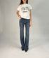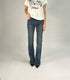 Jeans in denim blu a vita media, con gamba leggermente svasata. Un modello dal fascino intramontabile che unisce comfort e stile, ideale per look casual raffinati.