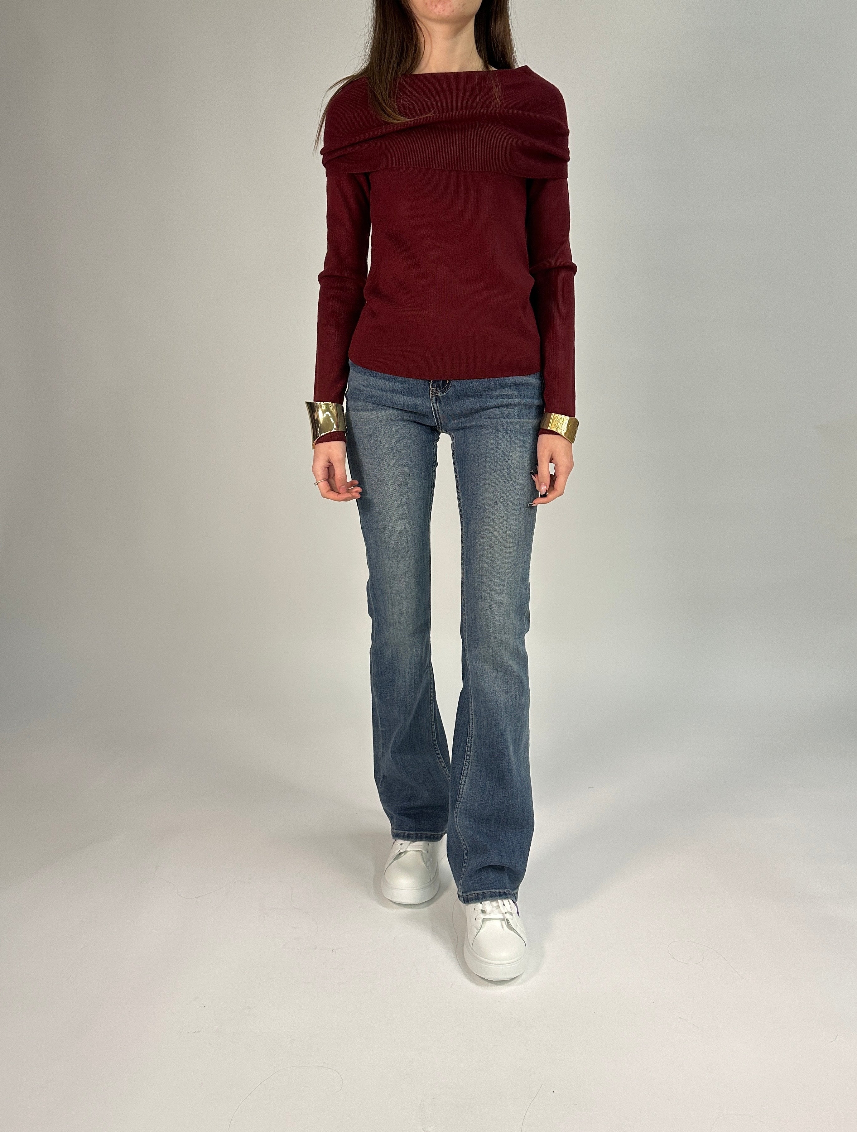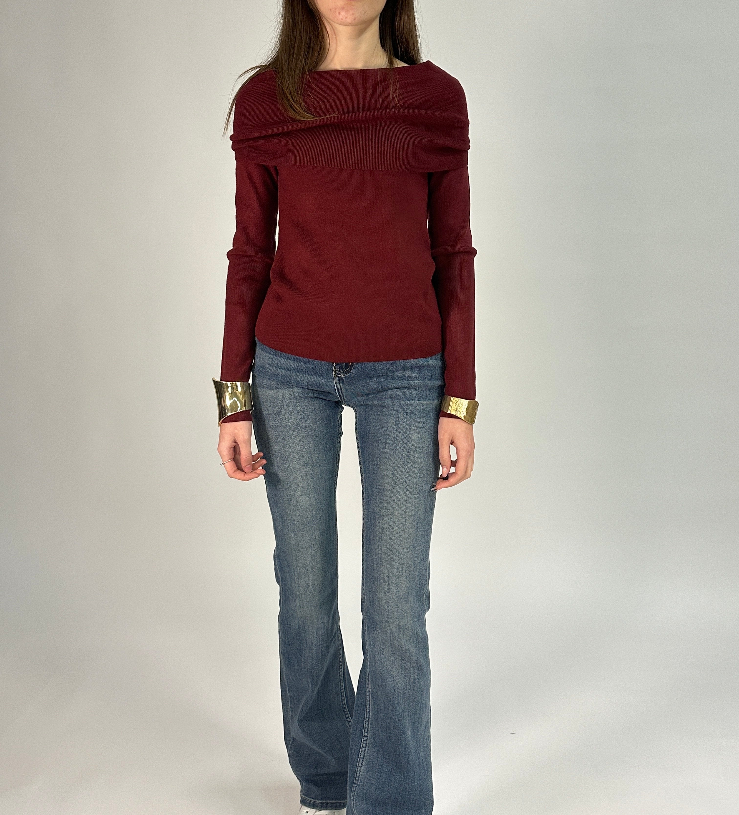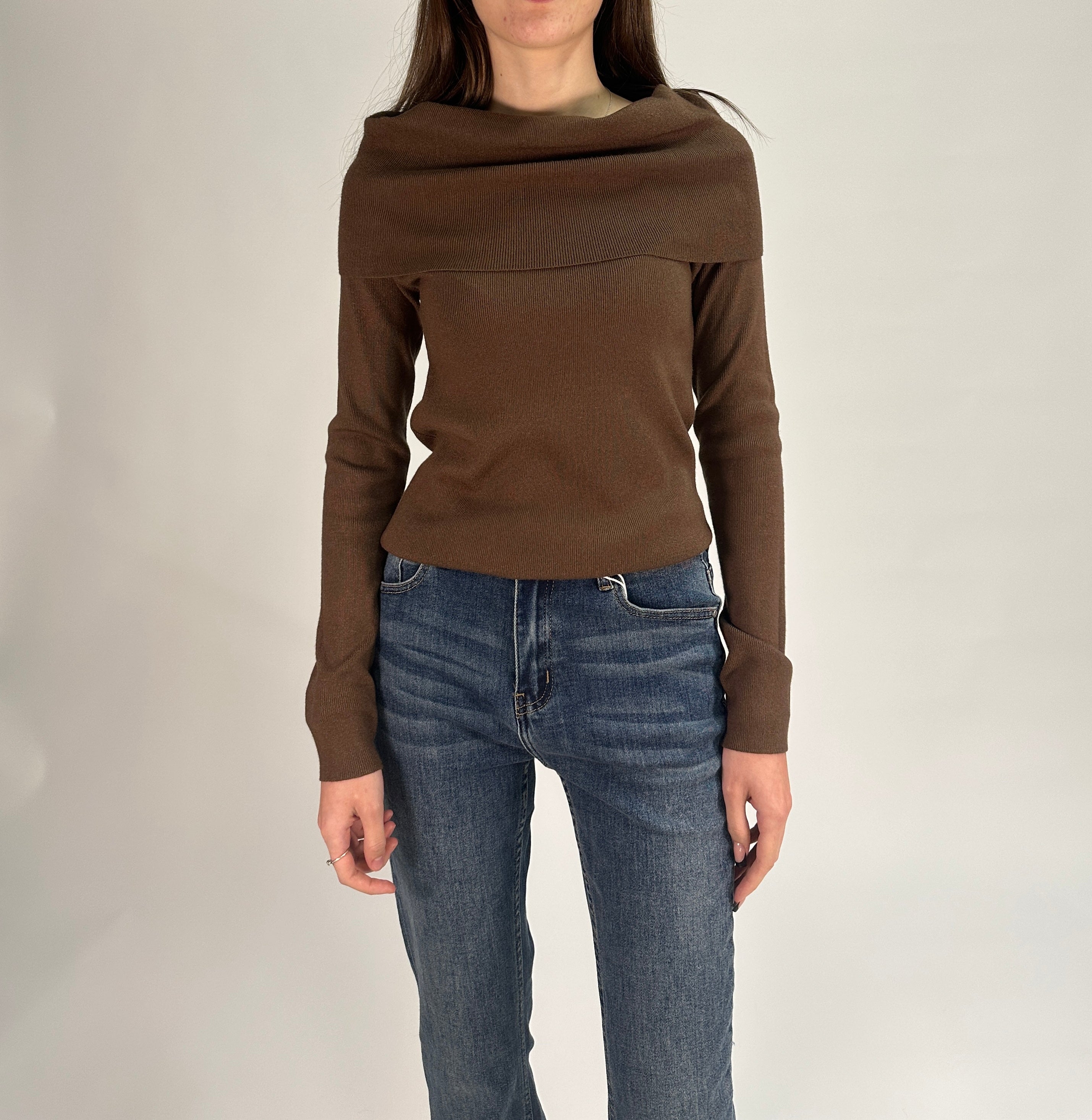 Elegante maglia a maniche lunghe in tessuto morbido, con scollo ampio a barca effetto spalla scoperta. Perfetta per un look femminile e raffinato