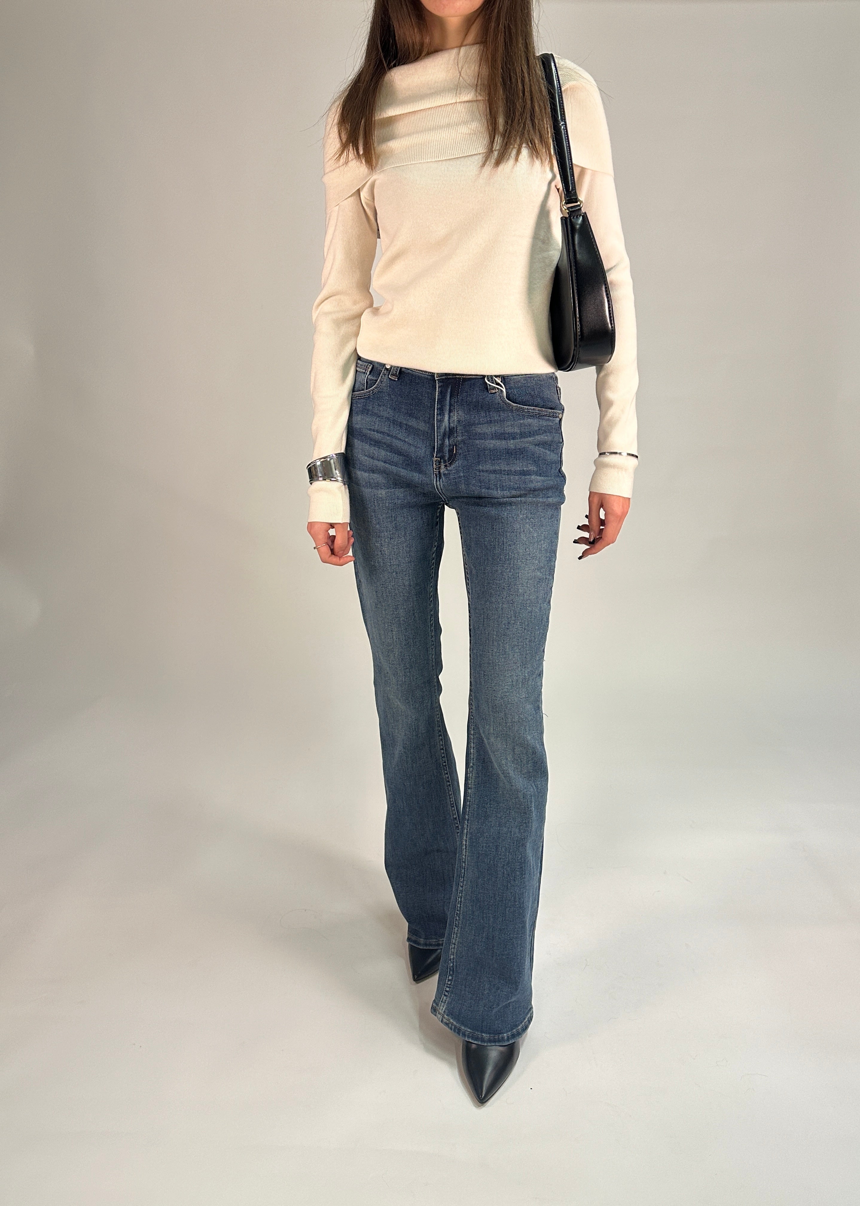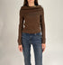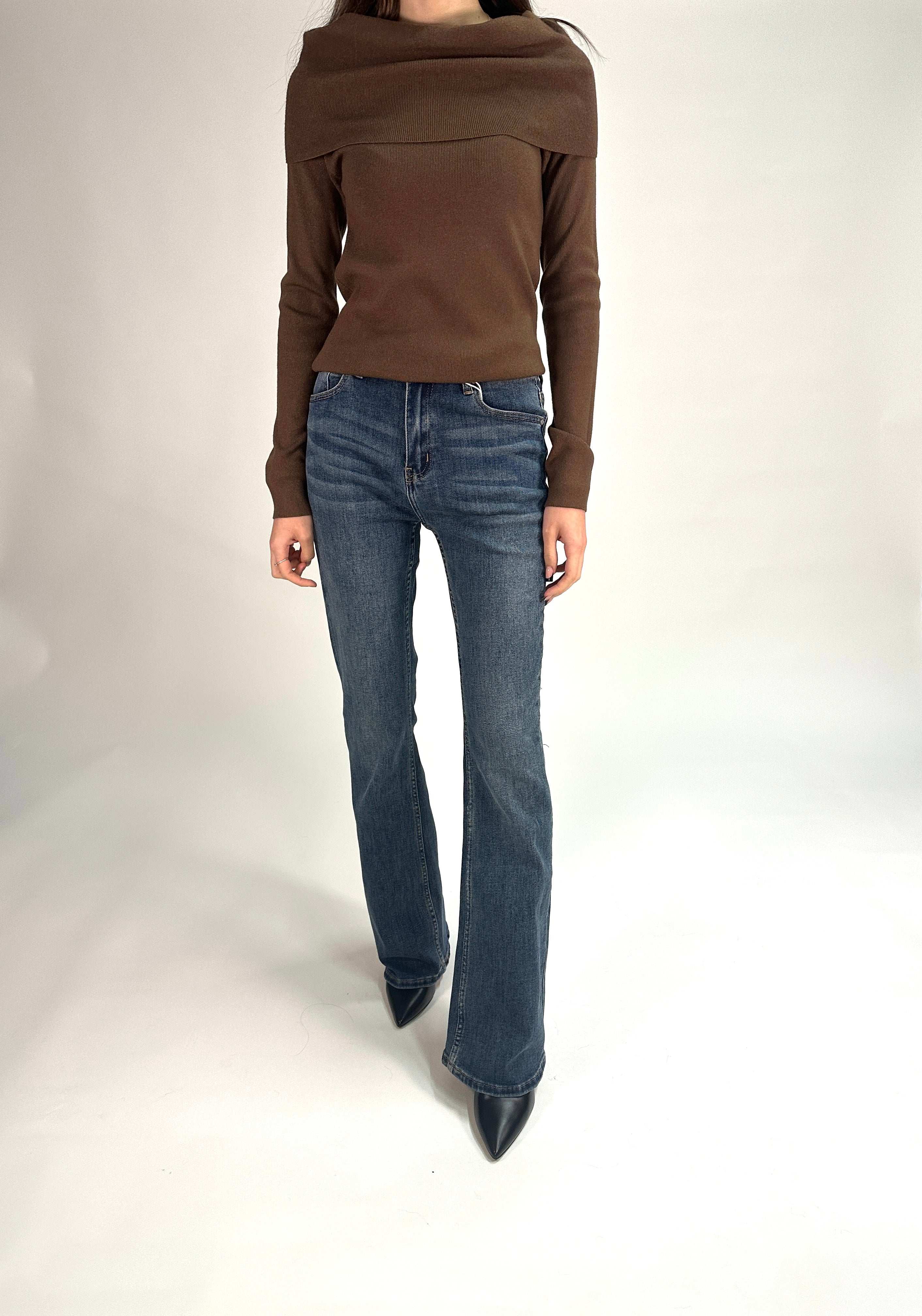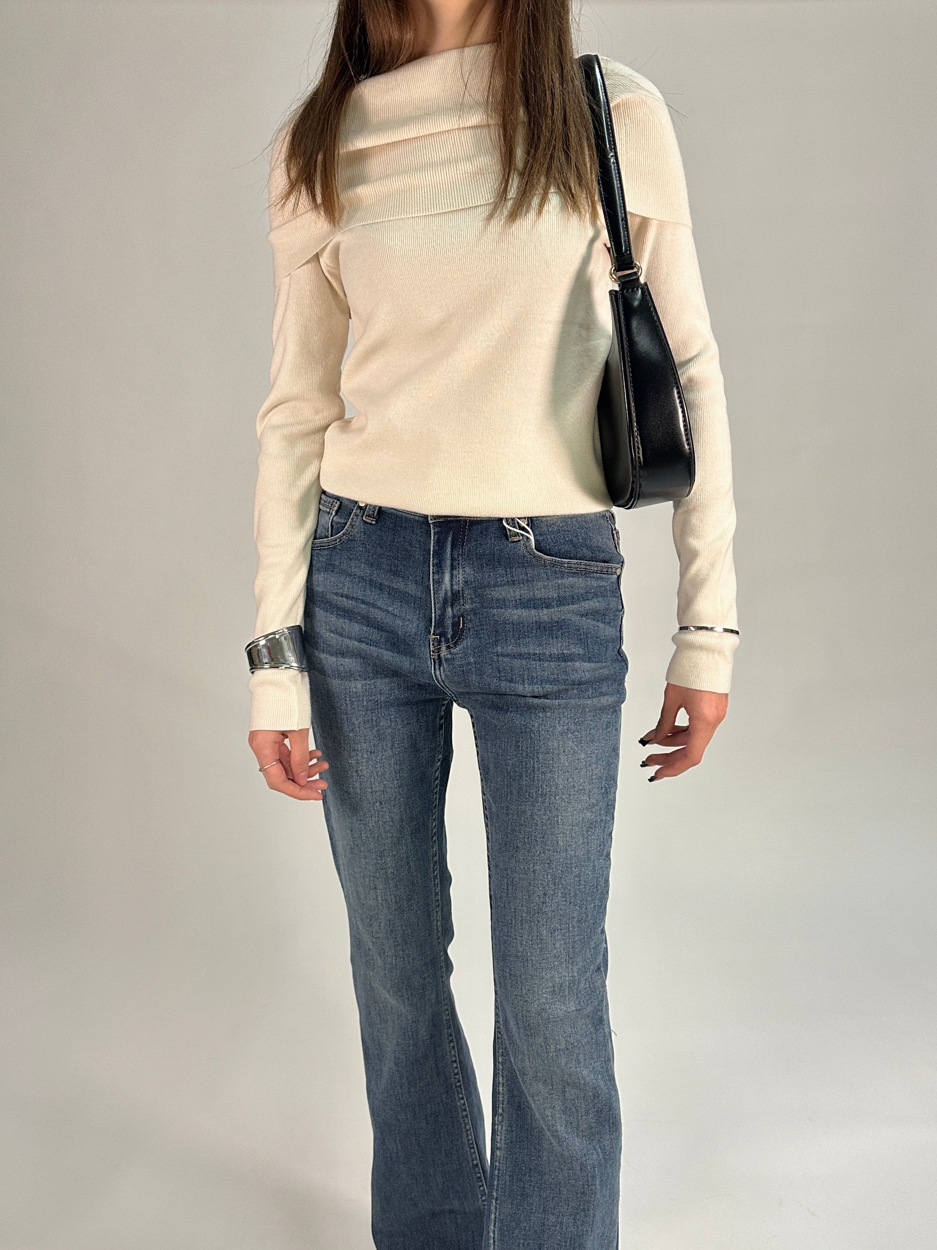 Elegante maglia a maniche lunghe in tessuto morbido, con scollo ampio a barca effetto spalla scoperta. Perfetta per un look femminile e raffinato