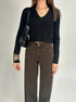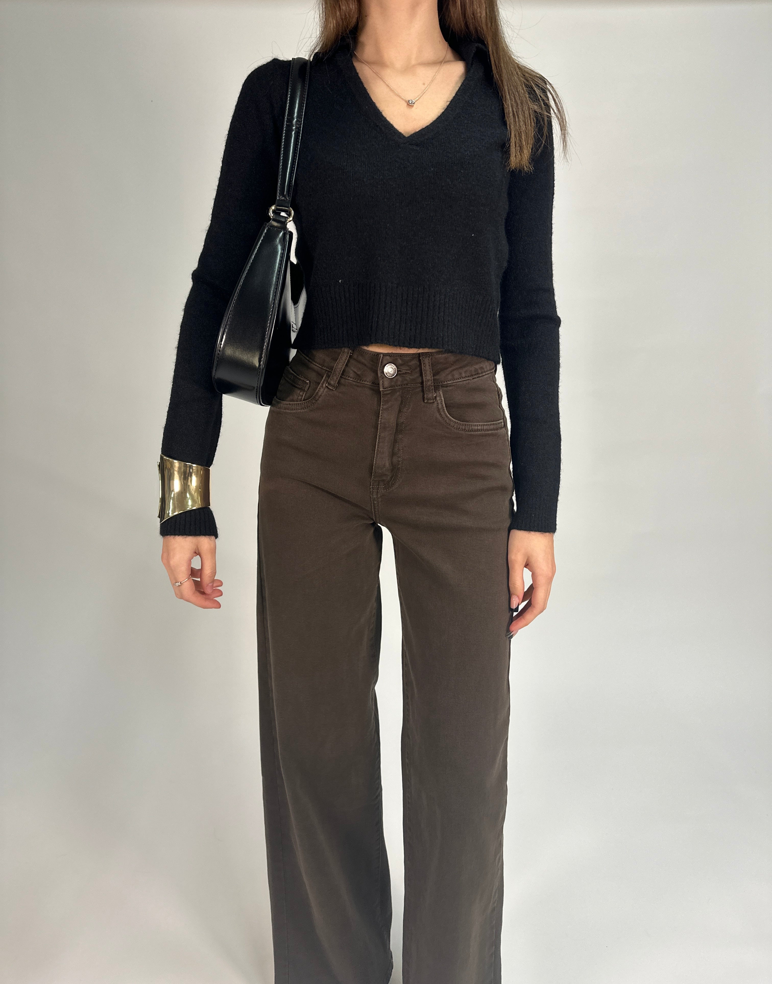 Maglia in maglia morbida con taglio corto e linea aderente. Presenta un elegante scollo a V abbinato a un colletto a camicia per un look casual ma curato. Perfetta da abbinare a jeans o pantaloni a vita alta per outfit versatili e contemporanei.