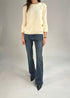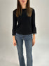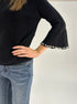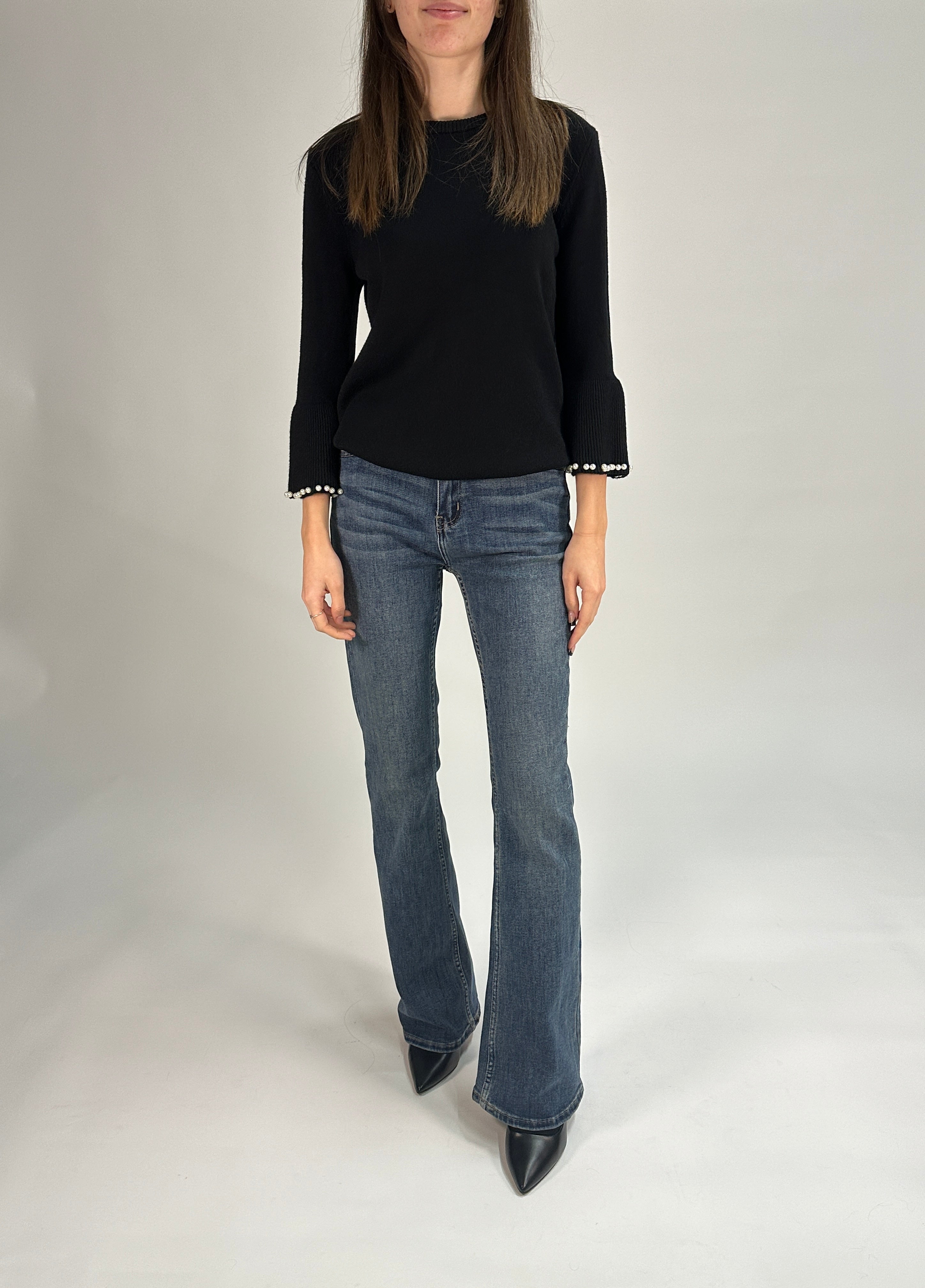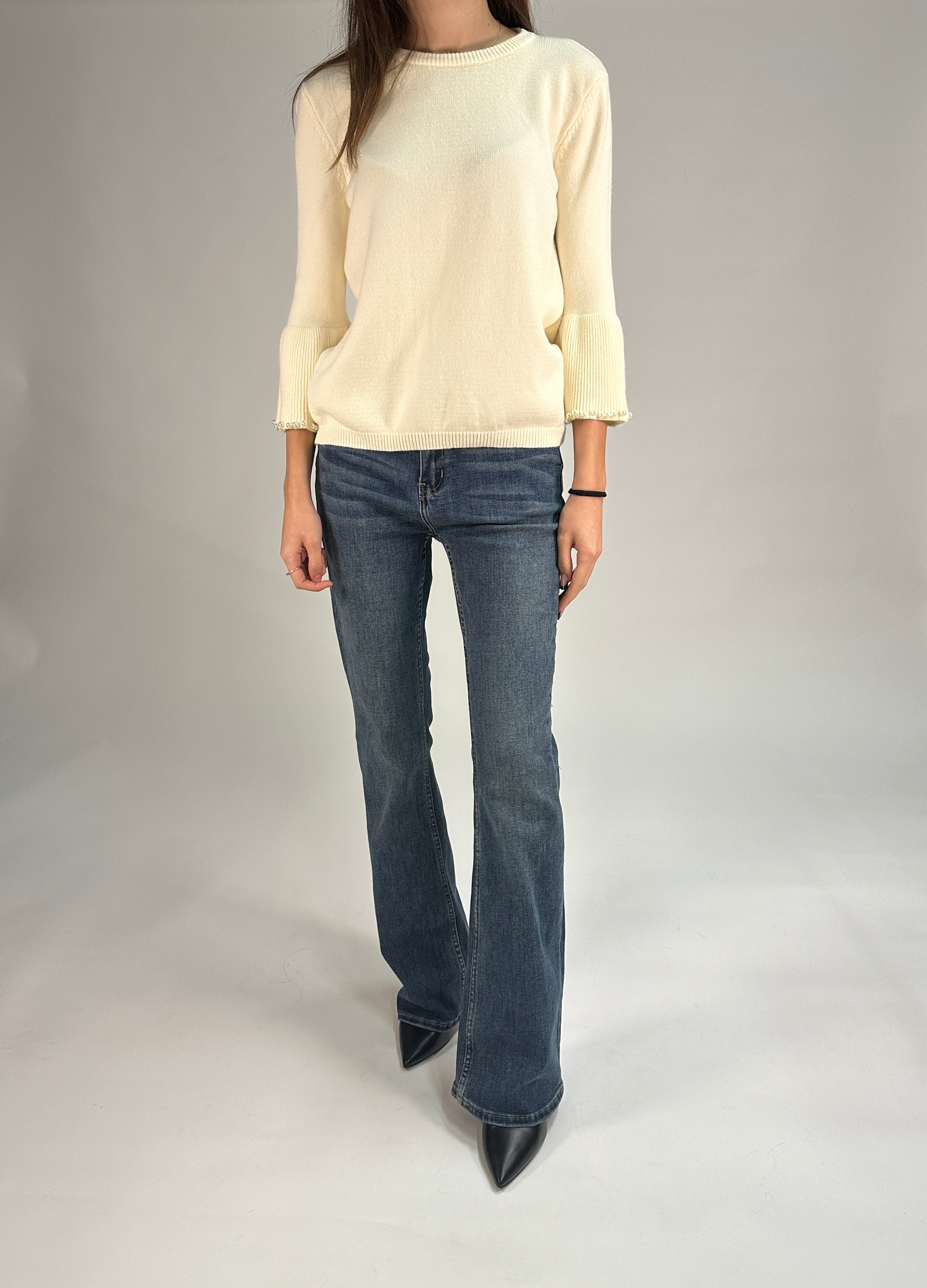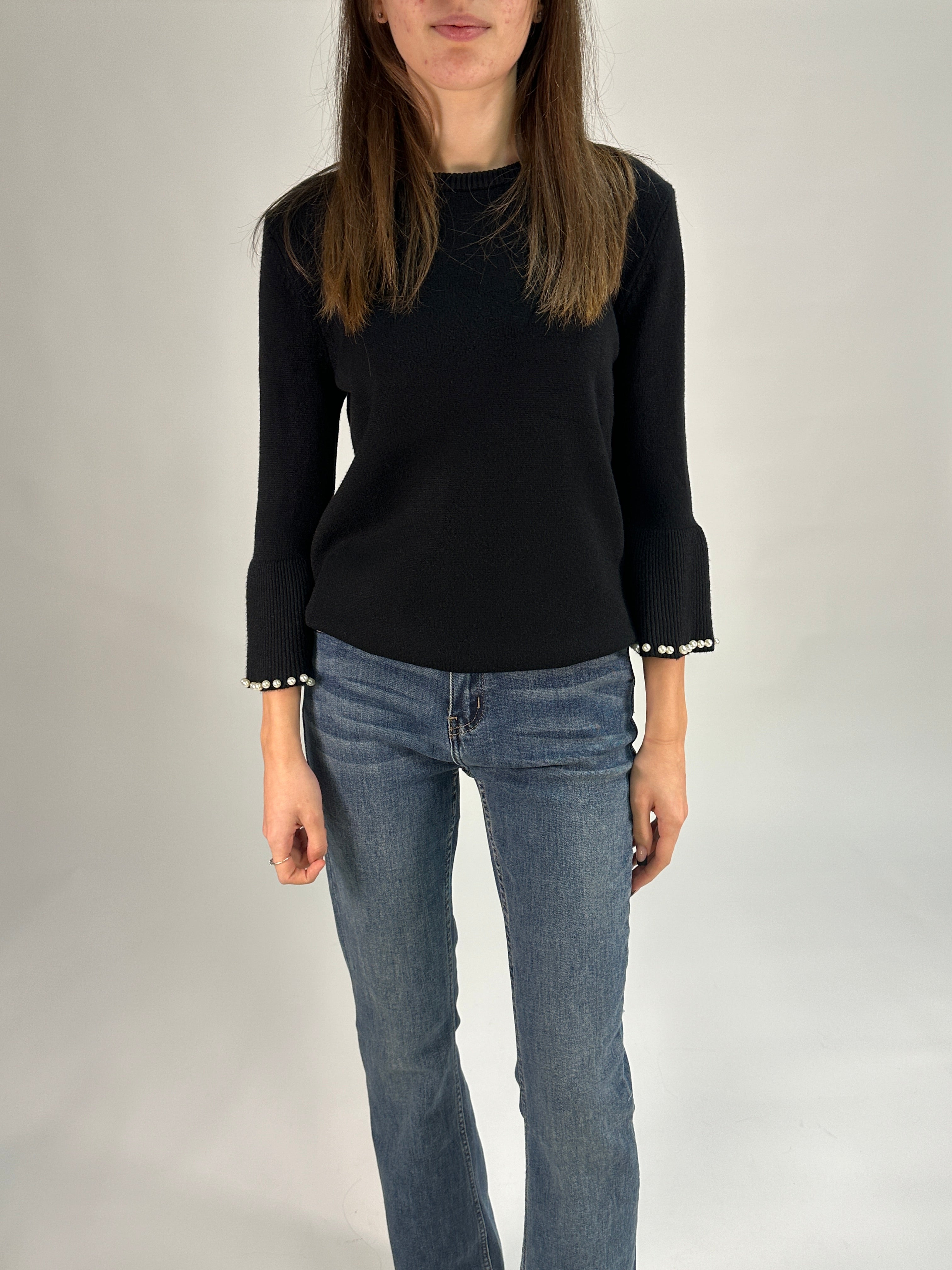 Maglia in filato leggero con scollo tondo e vestibilità morbida. Le maniche a campana sono arricchite da perle applicate sul fondo, che donano un tocco elegante e raffinato. Ideale per completare look casual o più ricercati con stile.