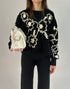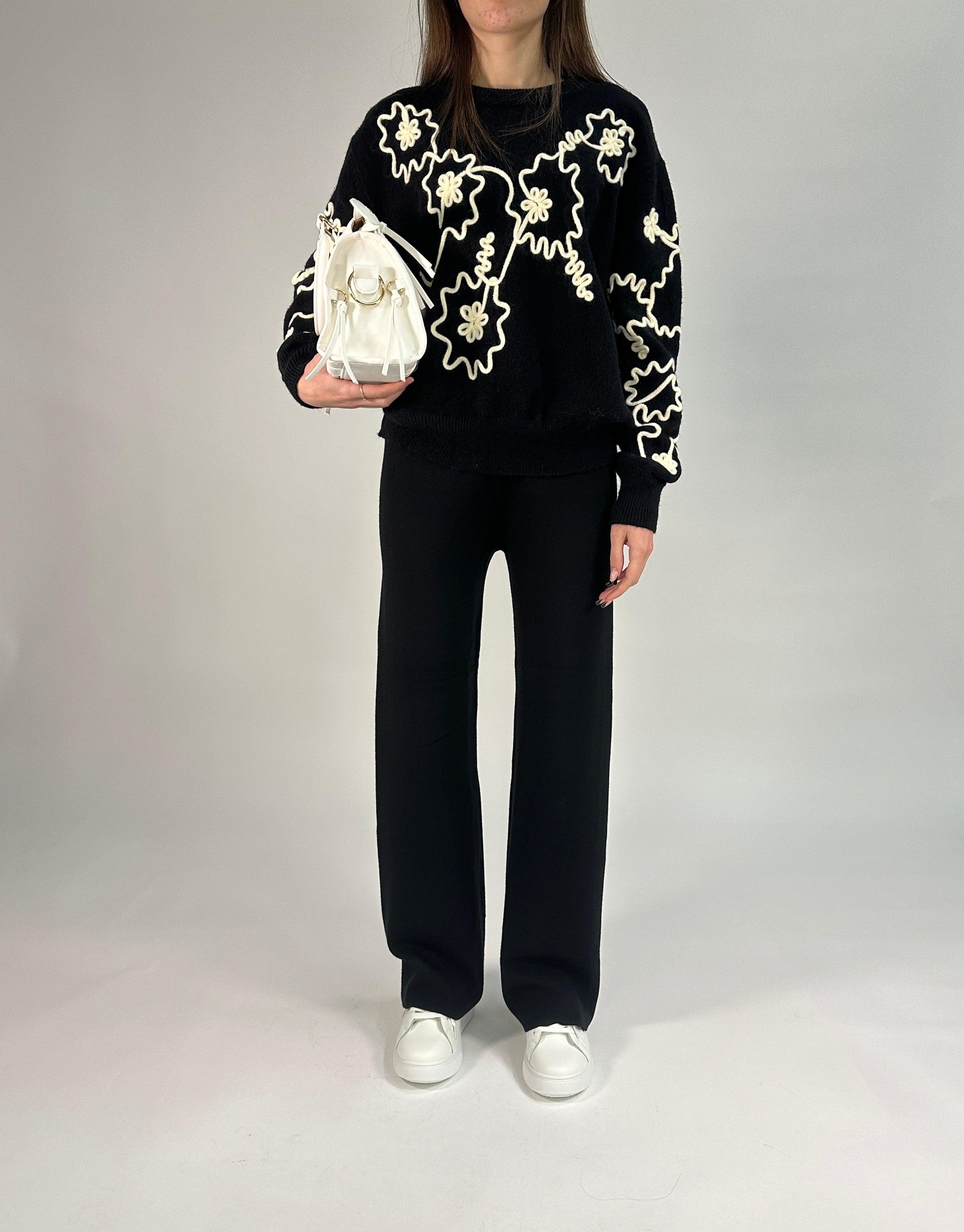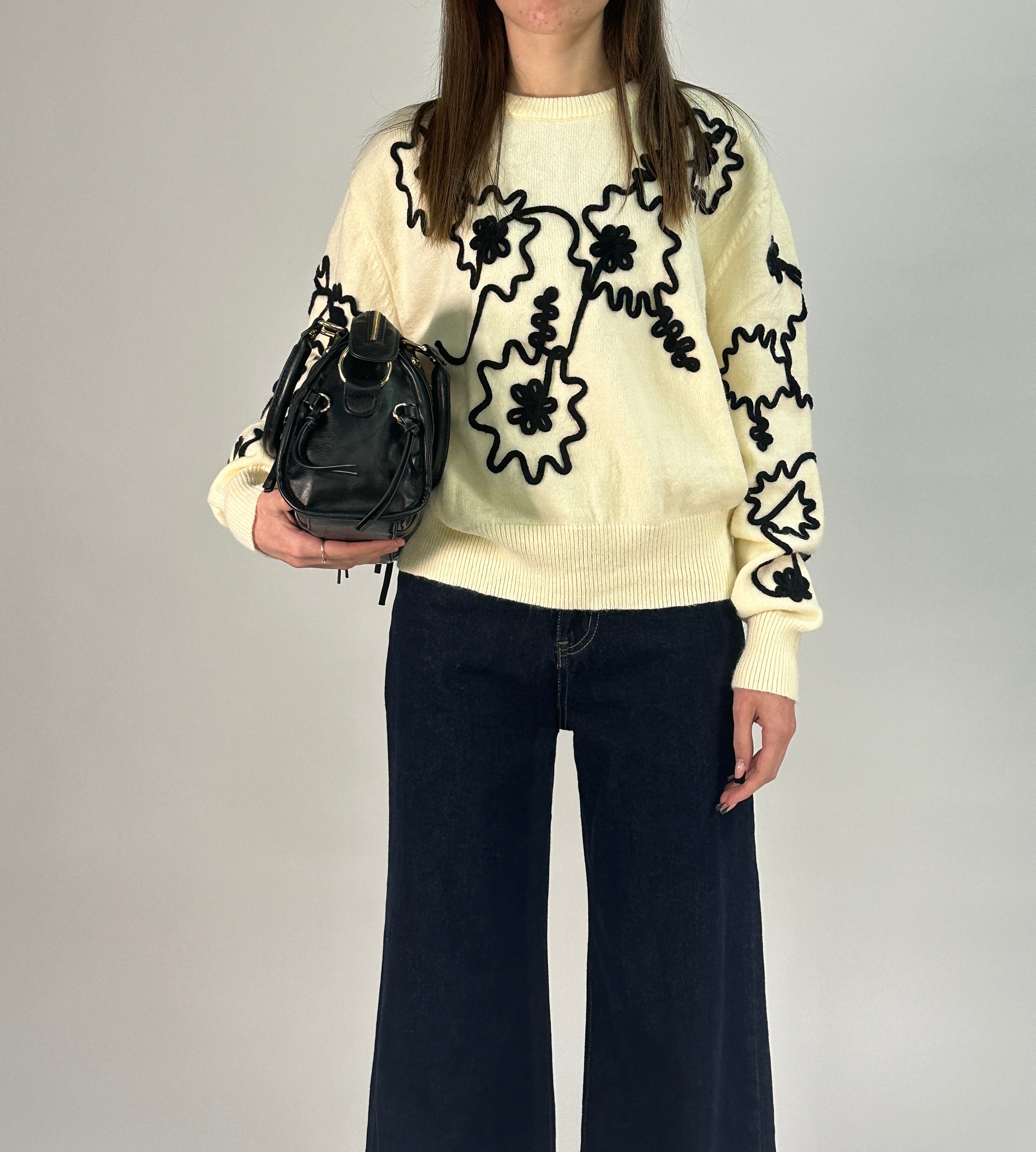 Maglione dalla linea morbida in filato soffice, impreziosito da un motivo floreale tridimensionale in rilievo. Il design grafico dona carattere al capo, rifinito con collo, polsi e fondo a costine per un fit strutturato ma confortevole. Ideale per look casual o sofisticati.
