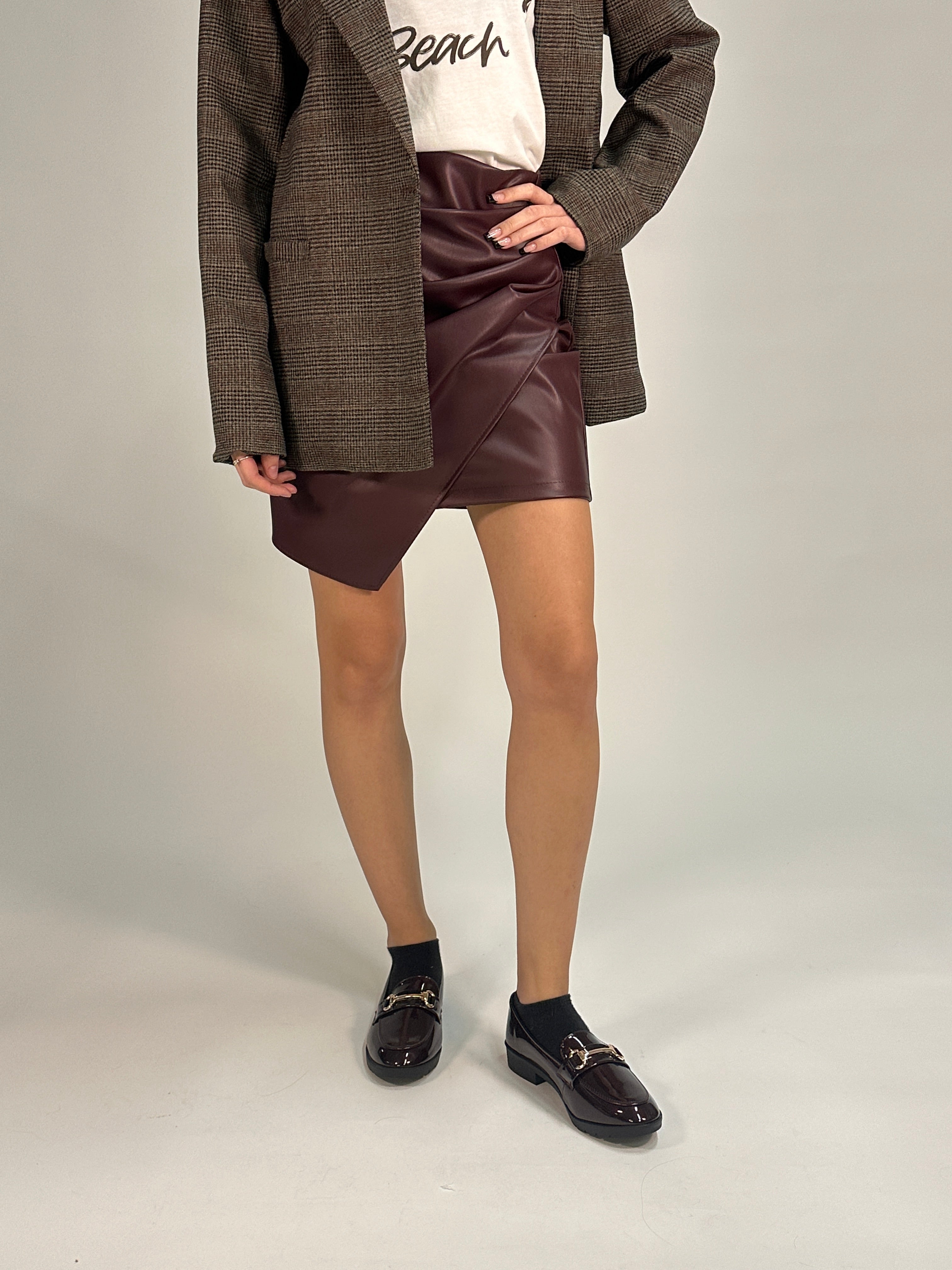Minigonna in similpelle bordeaux dal design moderno e grintoso. Il taglio asimmetrico a portafoglio dona carattere e versatilità, ideale per look audaci dal giorno alla sera.