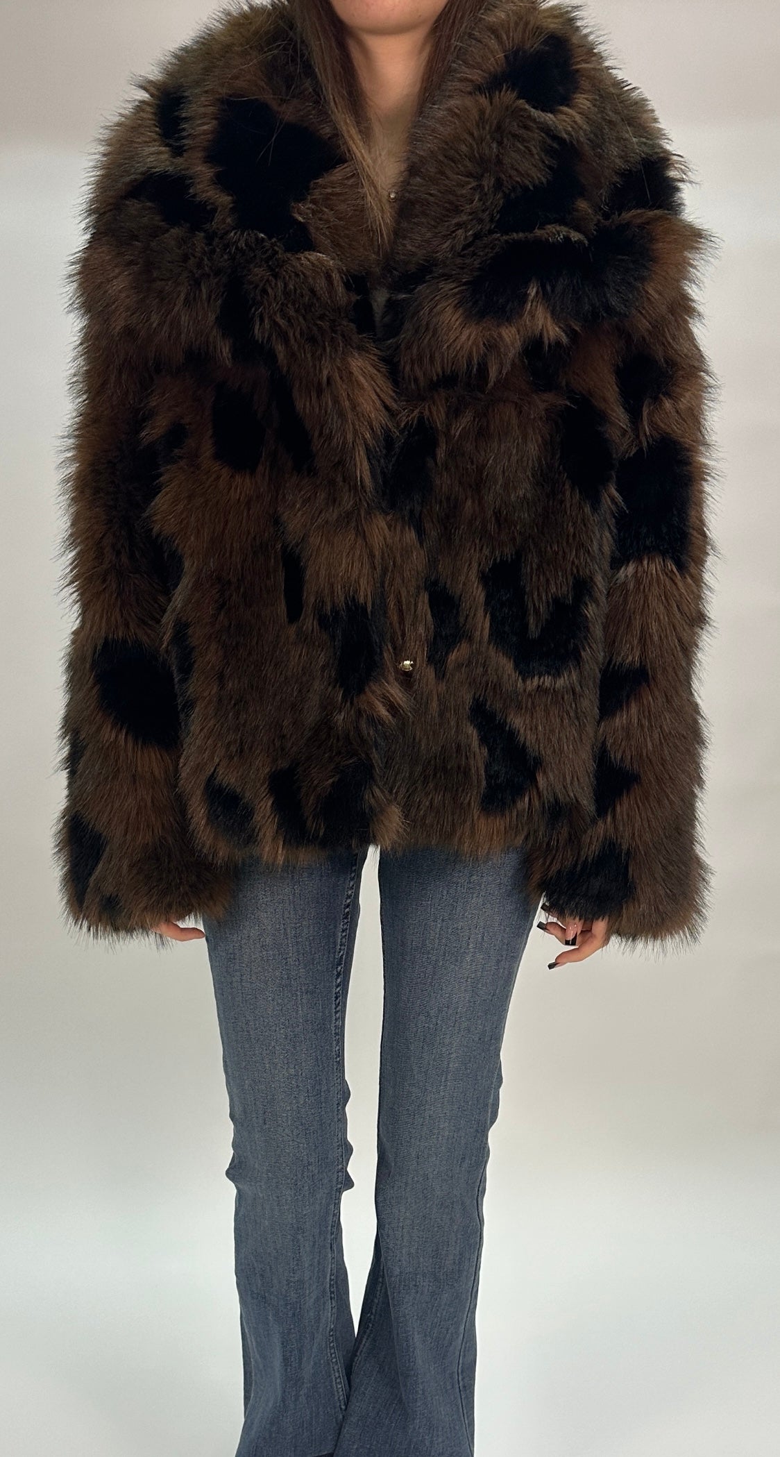 Pelliccia corta in morbida ecopelliccia animalier, elegante e audace. Ideale per valorizzare gli outfit invernali, si abbina facilmente a jeans e pantaloni scuri.