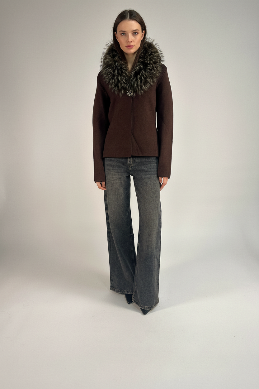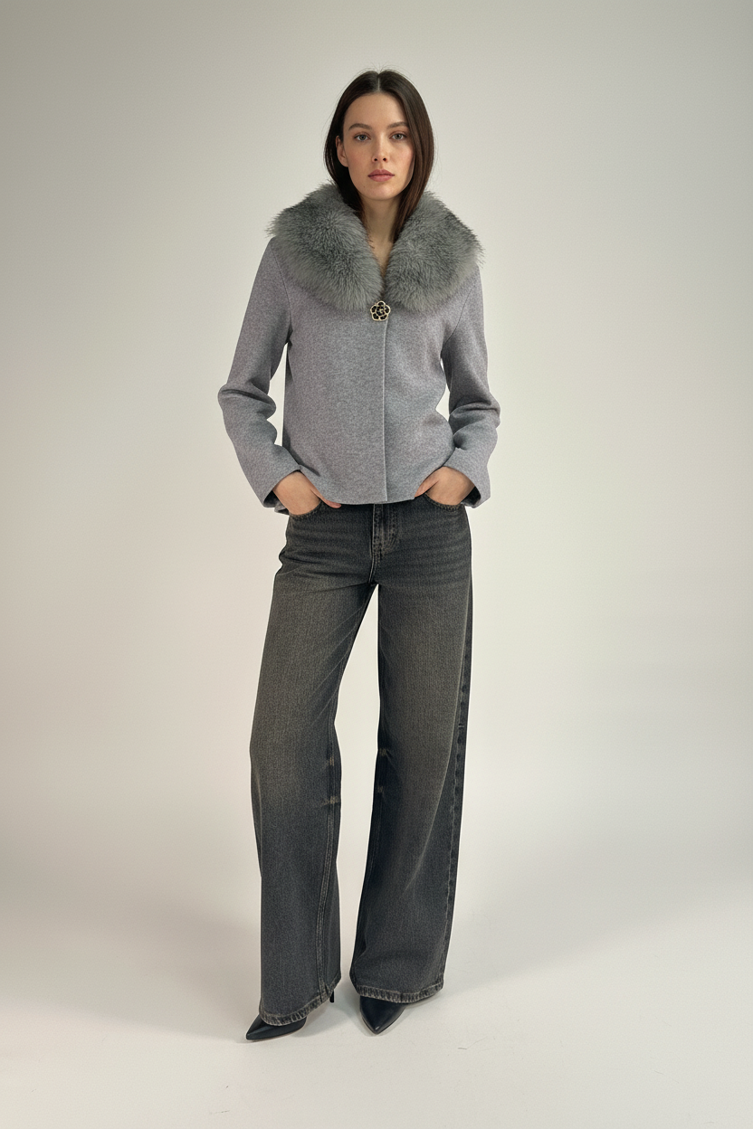Swenza in maglia dal taglio dritto, impreziosita da un ampio collo in eco-pelliccia tono su tono per un tocco elegante e avvolgente. La chiusura frontale è valorizzata da un bottone gioiello dorato. Un capo versatile e raffinato, ideale per la stagione autunnale e invernale