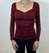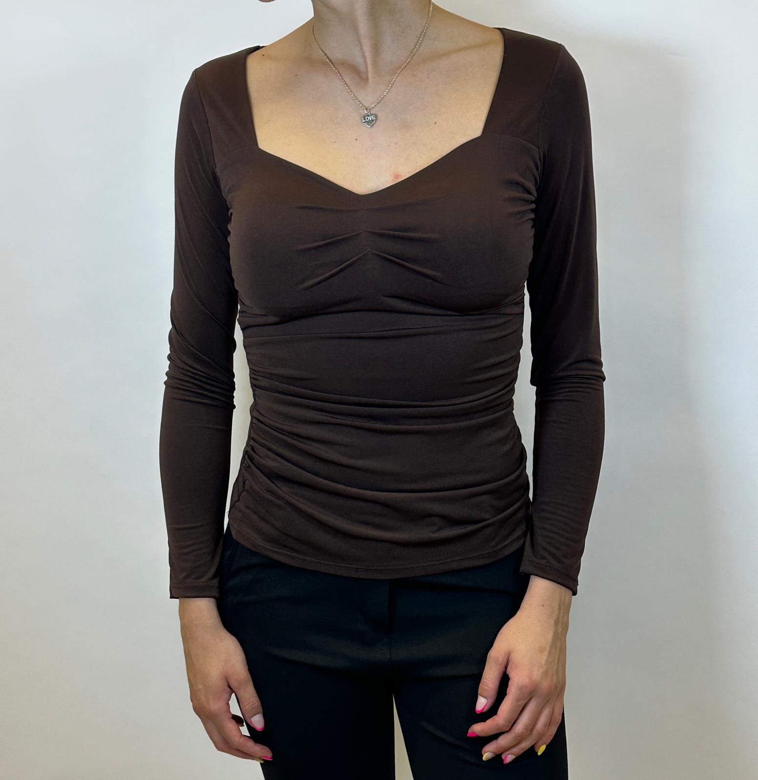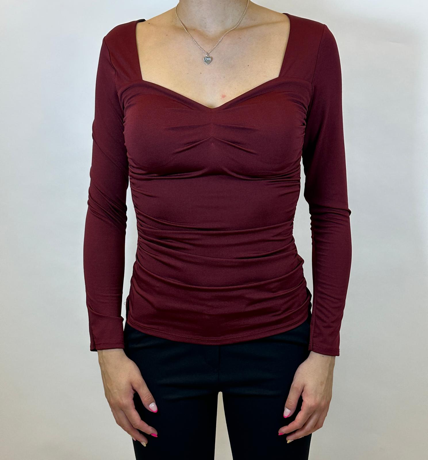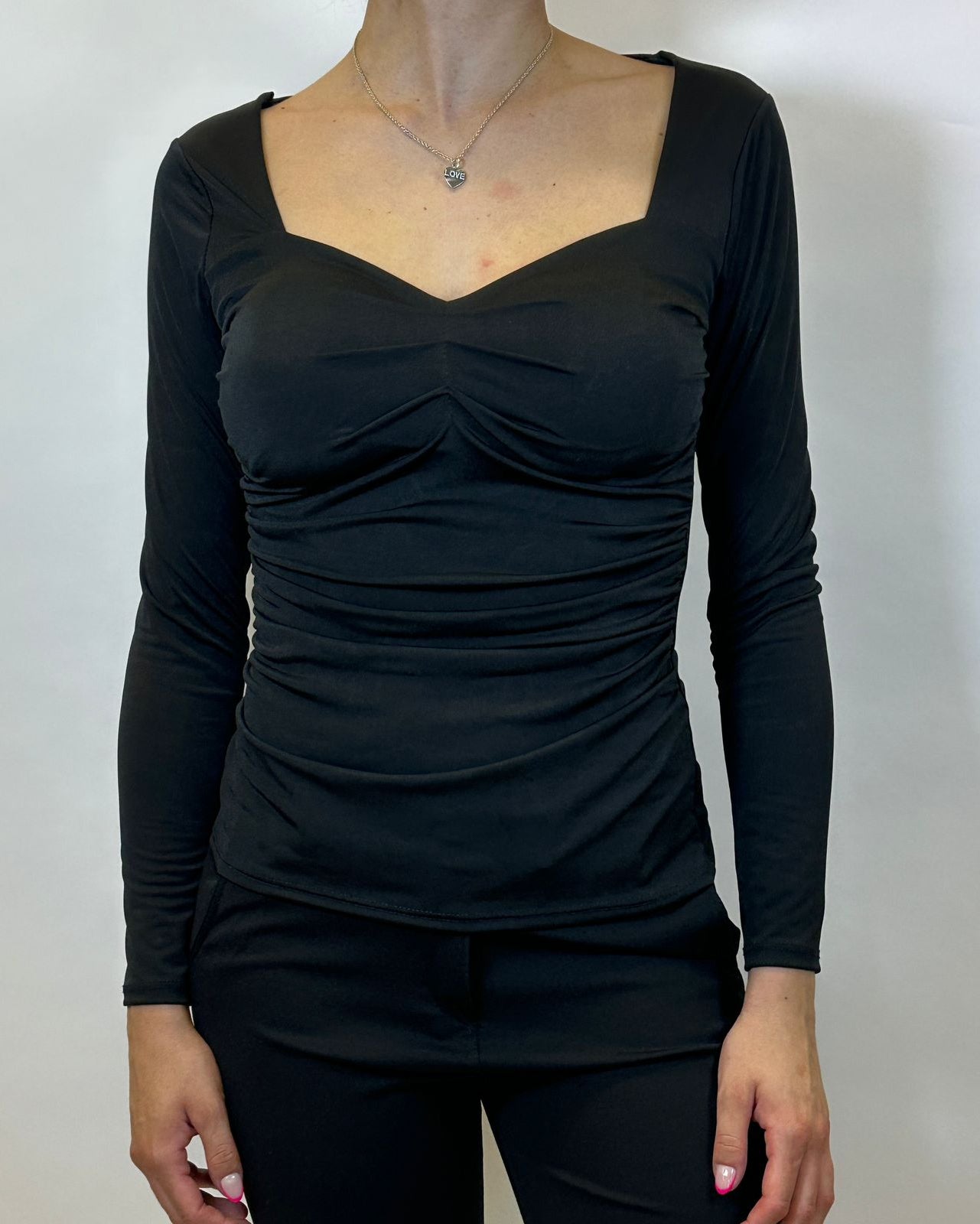 Top a maniche lunghe con scollo a cuore, dettagli arricciati sul busto e sulla parte frontale, leggermente corto in vita per un effetto moderno e femminile.